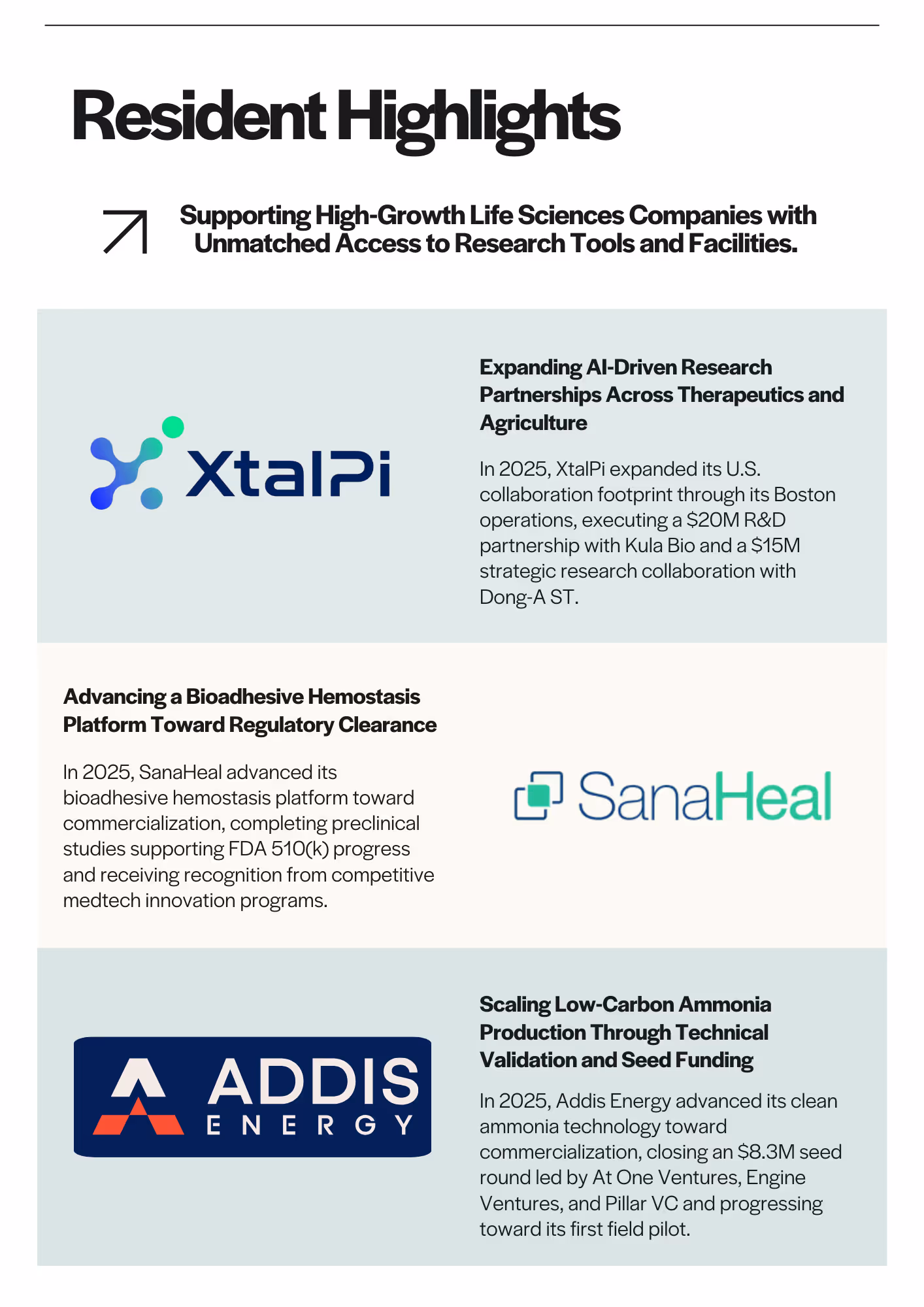 In 2025, Hatch.Bio Labs expanded its 50,000 SF Somerville facility with a new on-site vivarium, strengthening its role as a launchpad for life sciences companies. Through shared and private infrastructure, academic partnerships, lab bench prizes, and more than 30 community events, Hatch.Bio supported 23 resident companies and over 160 individuals, helping biotech founders and the broader scientific community launch and scale their ventures quickly.